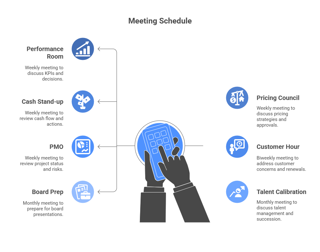 Cadence — short, fixed rhythms that force decisions: weekly performance room, pricing council, 13-week cash, PMO. Same agenda, time-boxed, owners named.
