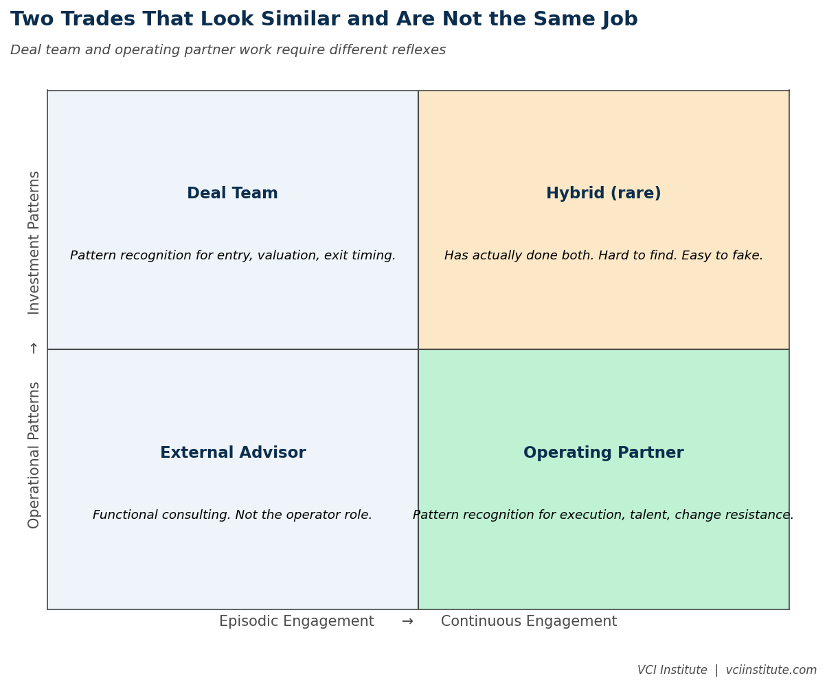 Firms that get this right end up with stronger operating partner teams, stronger deal teams, and better coordination between them. Firms that get this wrong end up with mediocre versions of both, because they hired people who looked like they could do both jobs but actually did neither well. The mistake is correctable. The first step is recognizing that the two trades are different jobs that look similar from a distance, and that the distance is exactly what makes the confusion so common in an industry that has not yet been forced to articulate the difference clearly.