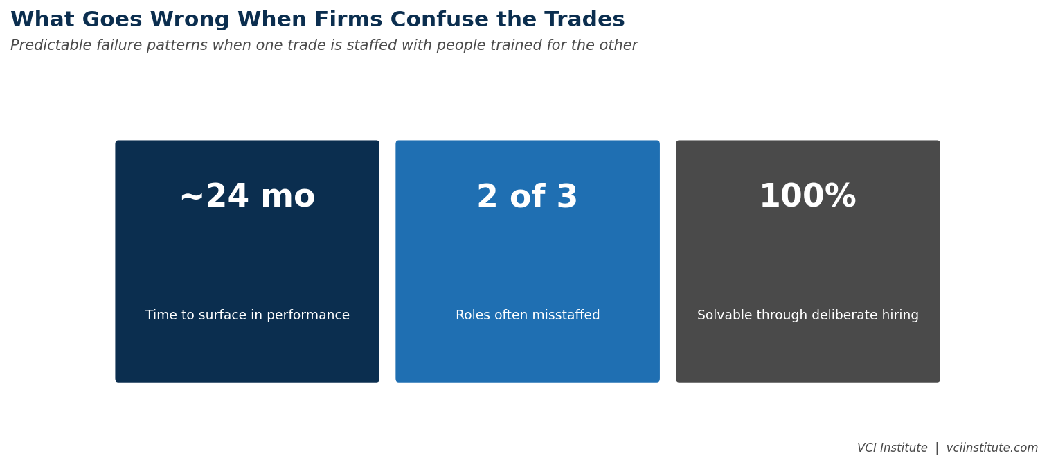 Both patterns share a root cause. The hiring decision was made on the assumption that the trades were similar and that strong performance in one would transfer to the other. The assumption is wrong. The trades use overlapping vocabulary but require different reflexes that are developed through different paths. Strong performance in one is, at best, weakly predictive of performance in the other.