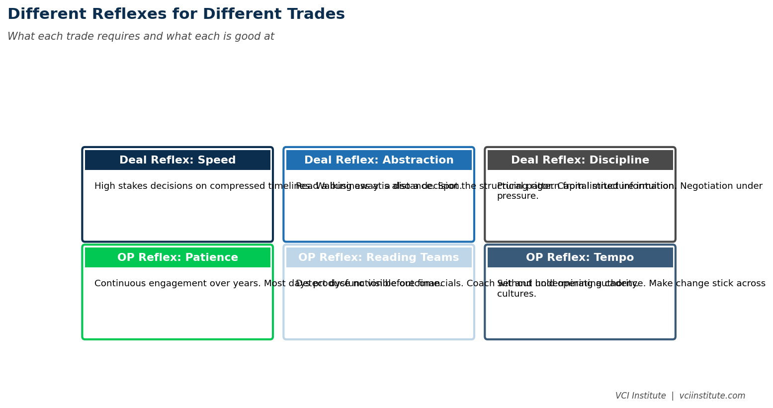 The operating partner's trade is the trade of execution inside portfolio companies. The reflexes that matter are pattern recognition for management effectiveness, for operating cadence, for change resistance, and for the gap between stated plans and lived reality. The time horizon is continuous and unfocused, with engagement that spans years of portfolio company hold rather than the discrete events of acquisition and exit.