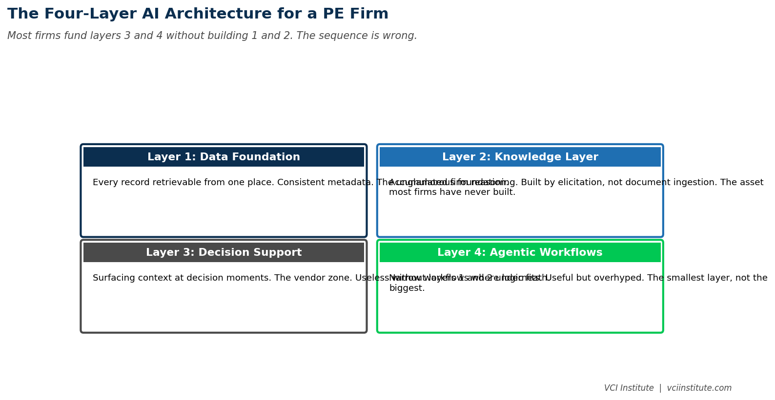 This is the pattern in 2026, and it is fixable. What it requires is to stop thinking about AI as a procurement question and start thinking about it as an architecture question. The architecture is not complicated. It has four layers. Most firms have funded layers two and three without building layer one, which is why nothing connects.