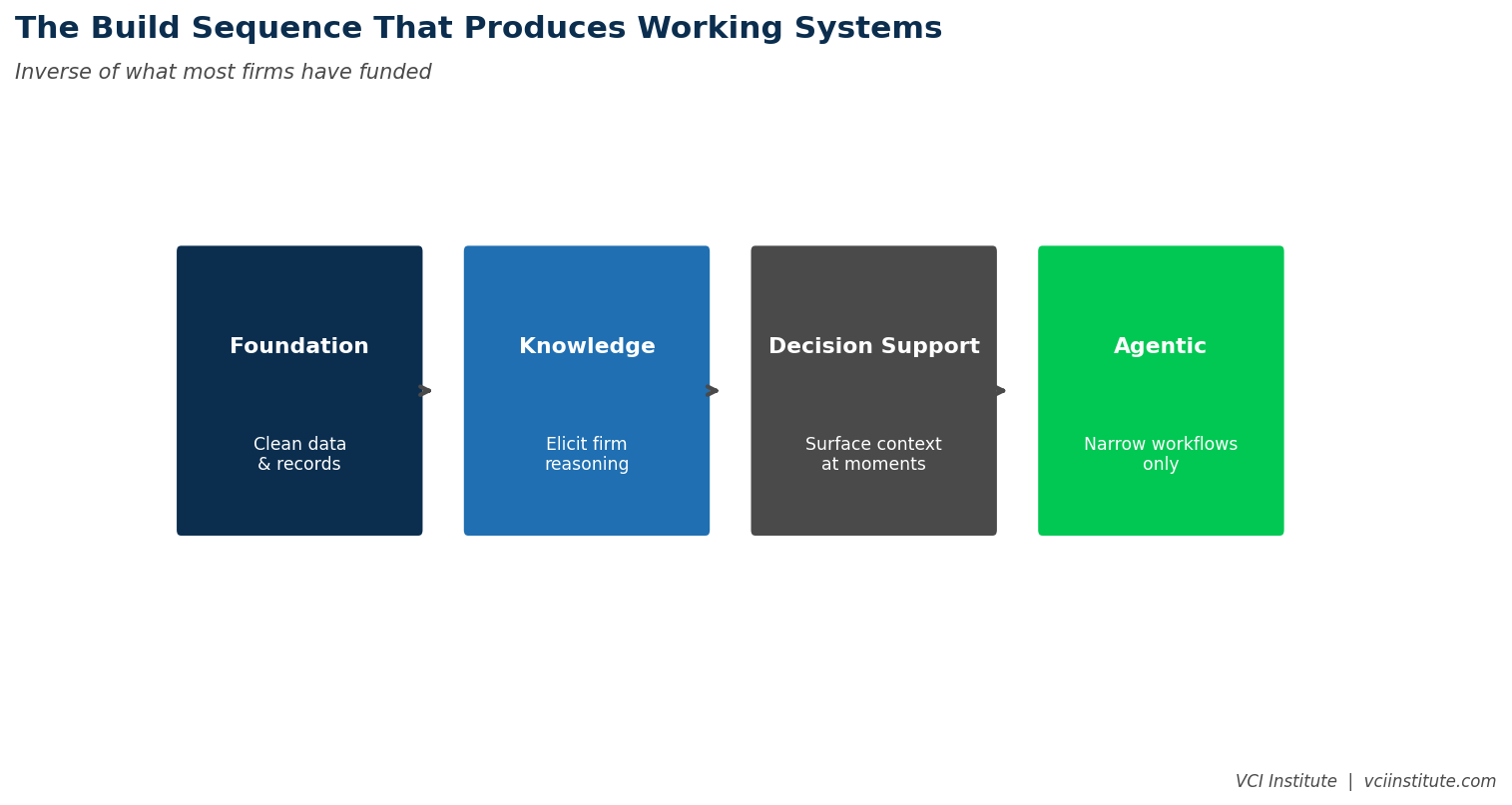 The sequence that produces working systems is the inverse of the sequence most firms have followed. Build layer one first. Make every important document, record, and metric retrievable from a single source, with consistent definitions and clear ownership. Build layer two second, by structured elicitation from the partners and operating leaders who hold the firm's accumulated reasoning. Only then build layer three, the decision support, against a foundation that can actually support it. Reserve layer four for narrowly defined workflows where the agentic logic genuinely fits.