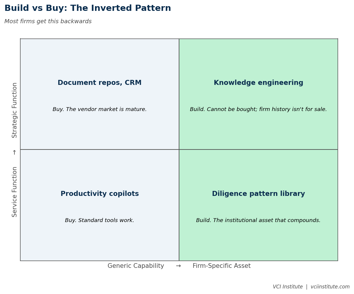 Most firms get this backwards. They build their own document repositories because that feels customizable, while buying their decision support layers from vendors who do not have access to the firm's institutional reasoning. The result is generic decision support running on bespoke infrastructure. The right pattern is the inverse. Buy the infrastructure, build the institutional asset.