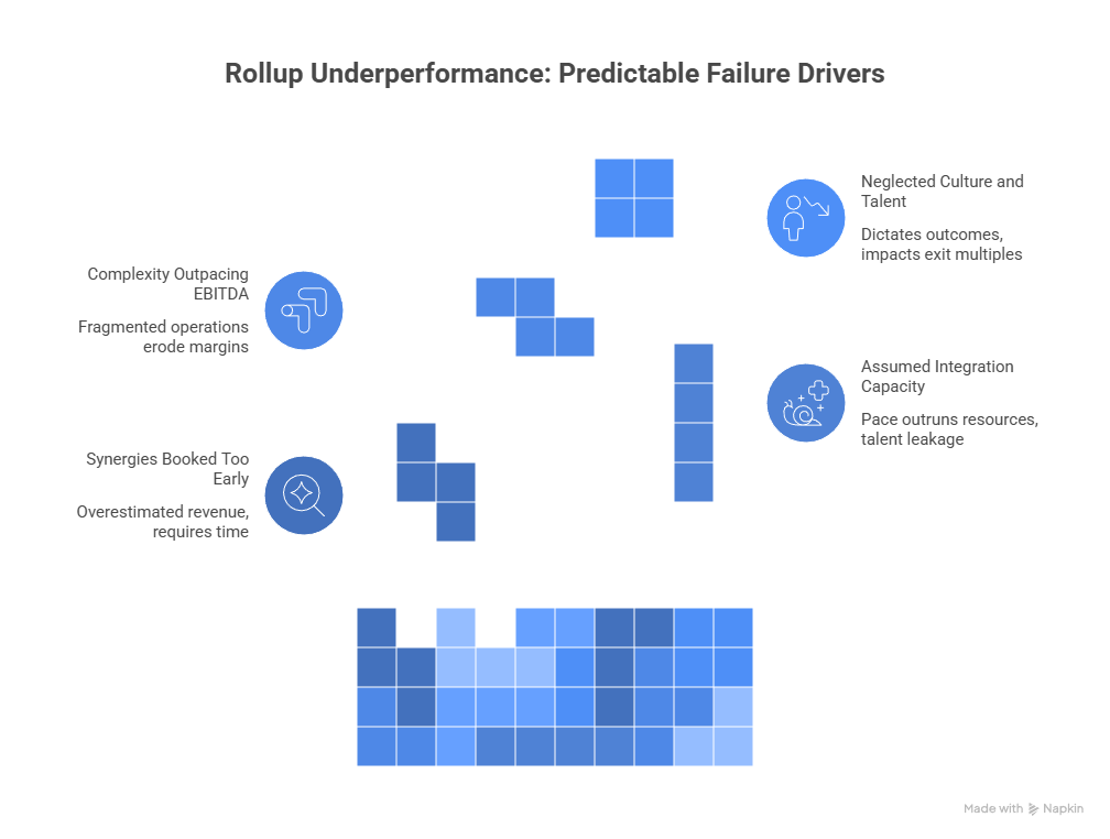 Most rollups underperform due to predictable issues, with 2025 data indicating that only high-quality platforms with clear integration roadmaps achieve outsized returns through multiple arbitrage—acquiring smaller assets at lower multiples and exiting at premiums. Key failure drivers include: