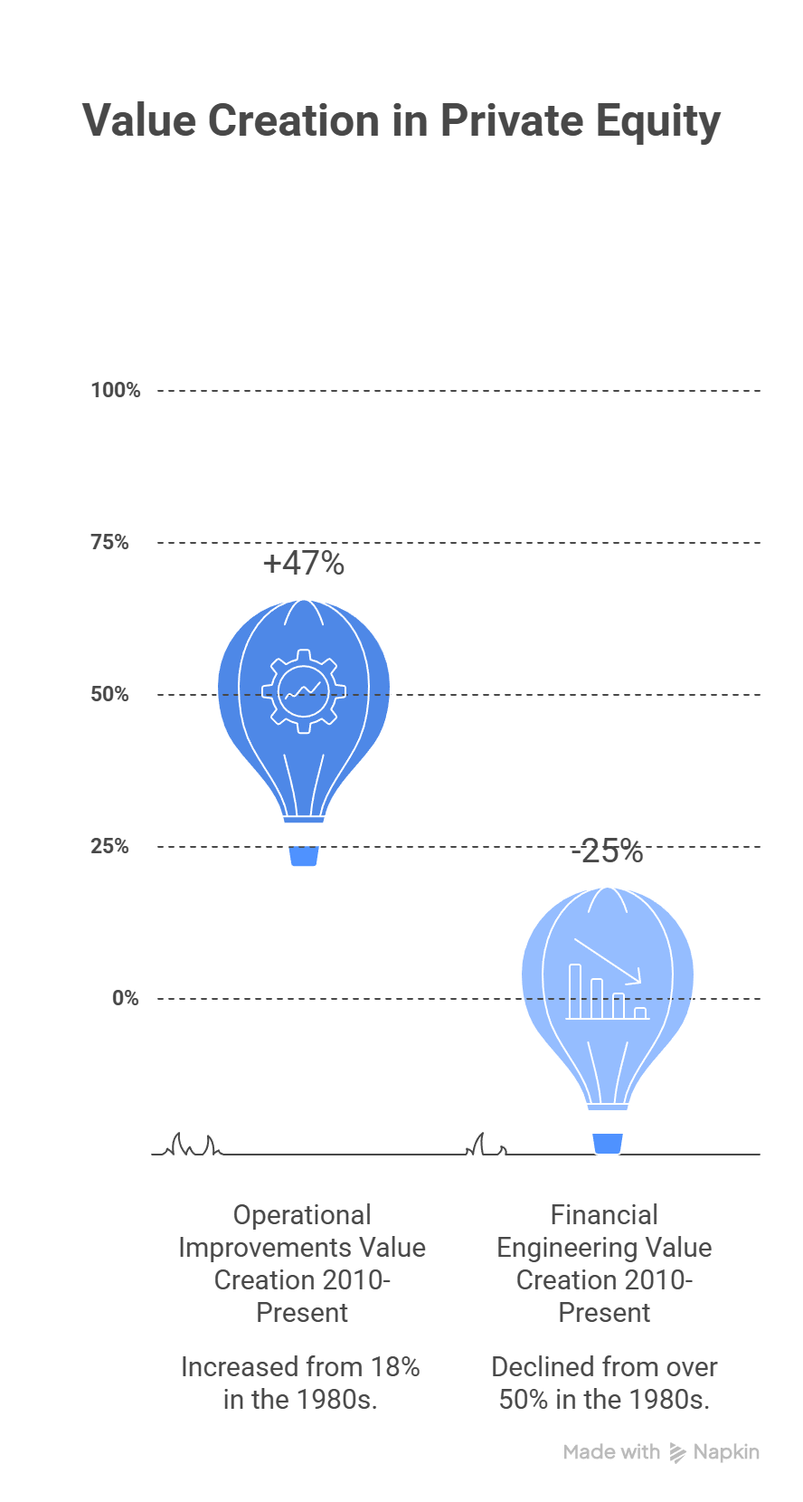 Since 2010, operational improvements have driven ~47% of buyout value creation, up from ~18% in the 1980s.