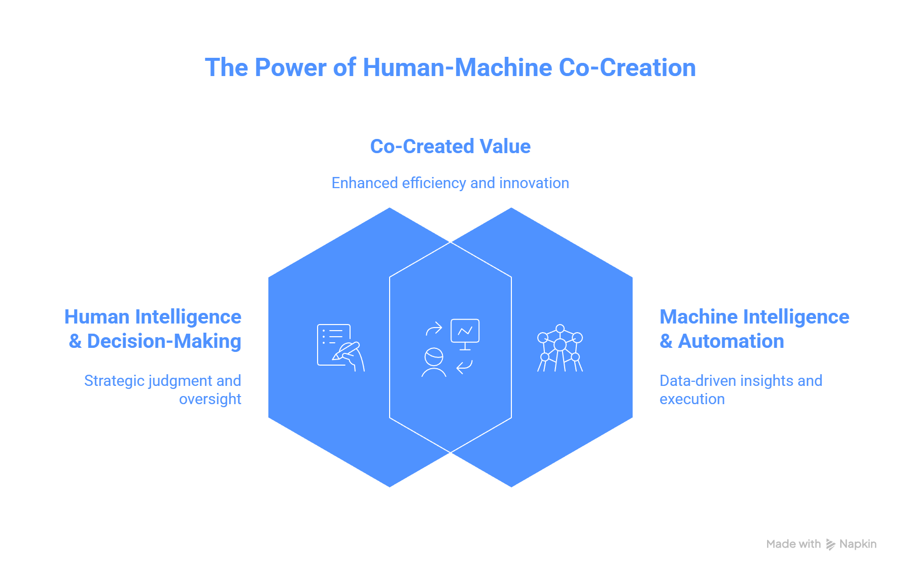 Human-machine co-creation is when humans keep decision rights and judgment, while machines provide continuous sensing, diagnosis, prioritization support, and workflow execution inside controlled boundaries.