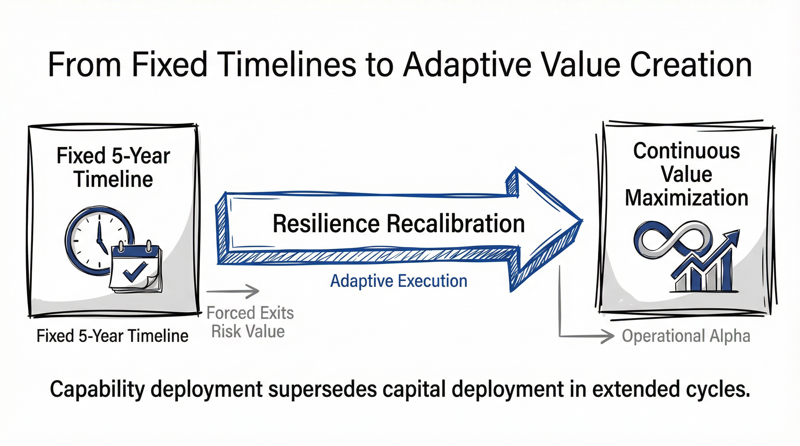 The market response to this inflexibility is the emergence of adaptive vehicles designed for endurance, what we term the Resilience Recalibration Fund. This is not a static fund structure, but rather an execution methodology and financing architecture built around the necessity of extending timelines productively.