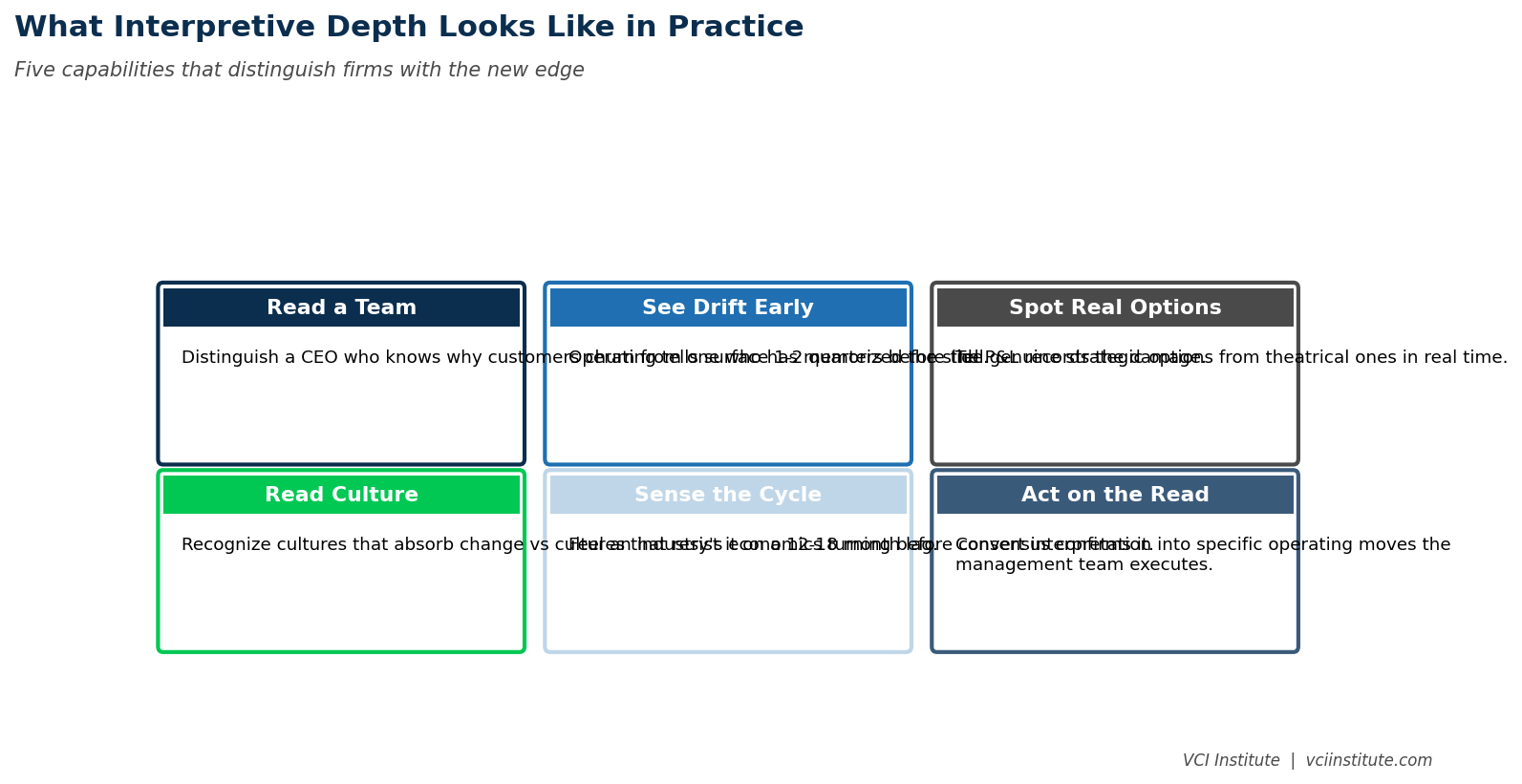Interpretive depth is easier to recognize than to define. It shows up in specific capabilities that the firms that have it can deploy and the firms that lack it cannot.