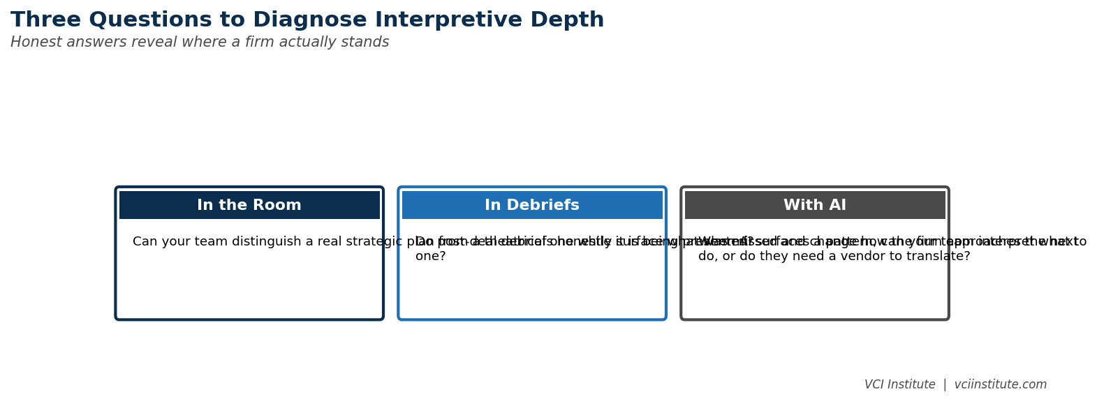 Do our debriefs of completed deals honestly surface what was missed and why, in a way that changes how the firm approaches the next similar situation. If yes, the firm is building interpretive capability over time. If no, the firm is getting older without getting wiser.