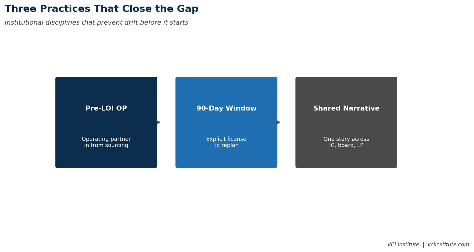 This practice is harder than it sounds. It requires the deal team to give up some of the autonomy they have historically held over the thesis. It requires the operating partner to commit time to deals that may not close. It requires the firm to accept that diligence becomes longer and more demanding because the operating perspective is being integrated rather than added at the end. Firms that have made this commitment report better outcomes. Firms that have not have continued to produce the drift pattern.