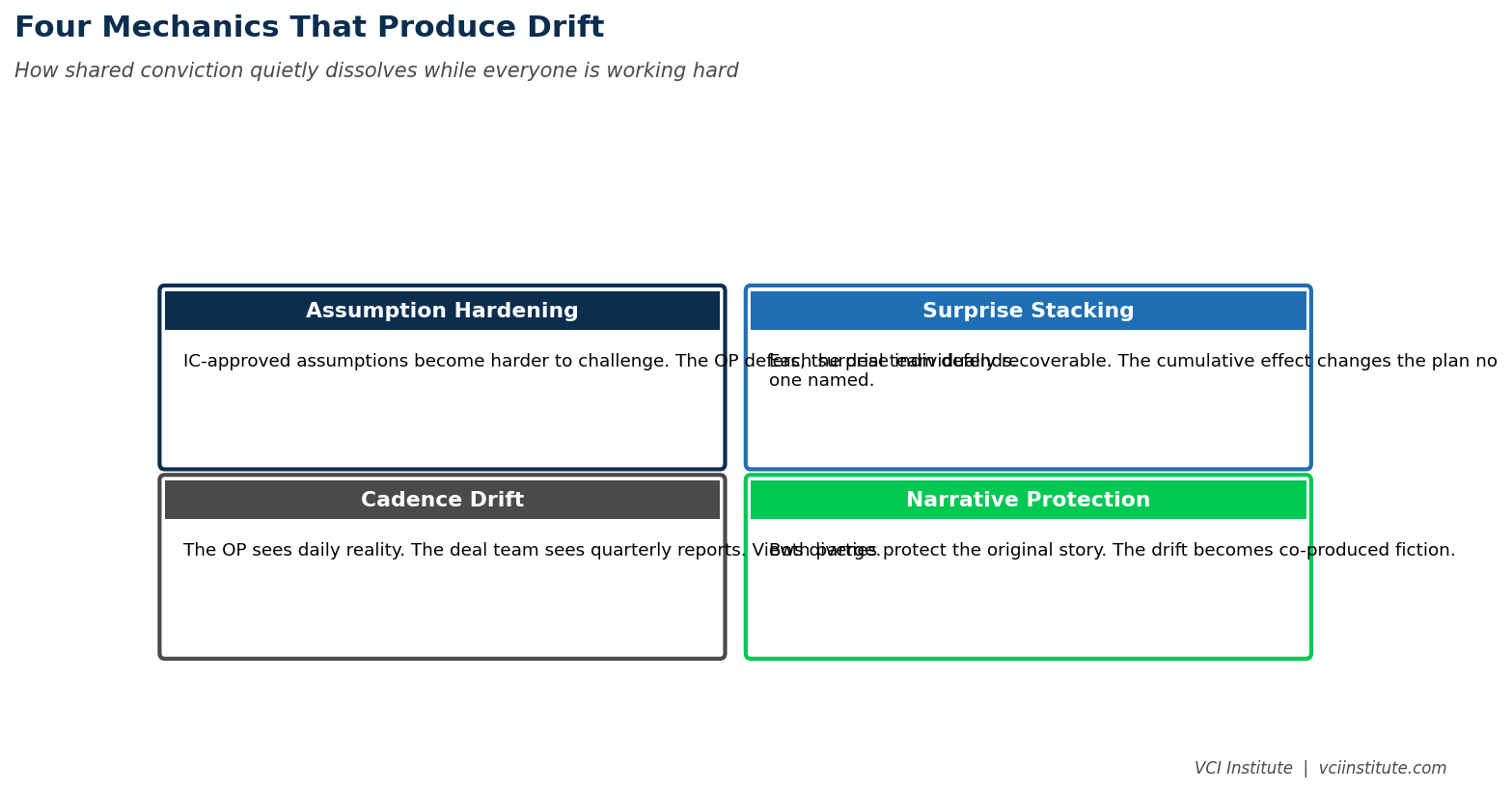 The fourth mechanic is the narrative protection. As the divergence grows, both parties have incentives to avoid surfacing it. The deal team does not want to acknowledge that the original thesis was incomplete. The operating partner does not want to be seen as the bearer of bad news. Both parties present whatever can be presented as success. The narrative diverges further from the operational reality. The drift becomes, by month nine, a co-produced fiction that neither party can easily exit.