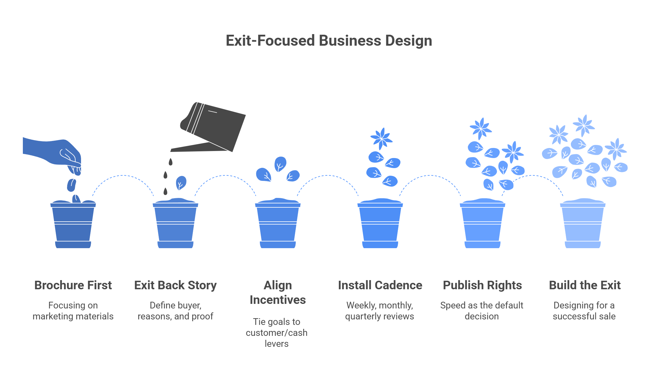 Write the exit back story on day 1. Who buys this, why, and what proof will they demand.